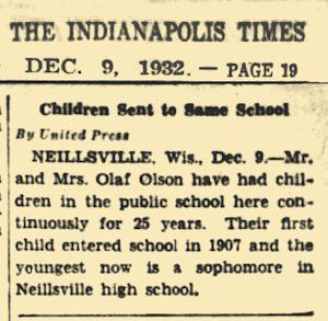 They are the parents of ten children, two of whom are dead: Francis, who died in infancy and Robert, who died at the age of 25. The living children are: Ellen, Mrs. Maynard Johnson, who teaches at Wausau; Barbara, Mrs. David Daniel, Cambria; Sallie, Mrs. Ewald Schwarze, Greenwood; Gilbert, Rice Lake; Fern, Mrs. Albert Holt; Kenneth; Mildred, Mrs. Lowell Dorn, Abbotsford; and Oluf, Jr., Wisconsin Rapids. They also have 24 living grandchildren. All nine of Mr. and Mrs. Olson’ children graduated from the Neillsville High School.