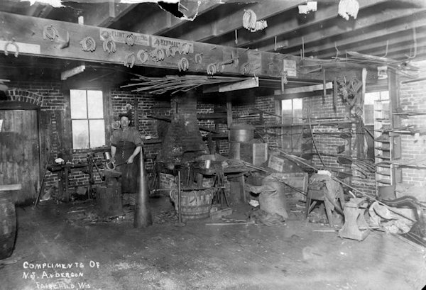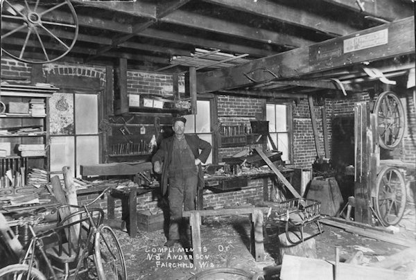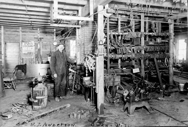 Mr. Anderson was born in Jetsmark, Denmark, Europe, May 26, 1860, and came to this country at age of 22, settling in Fairchild, where he was in partnership with his brother, Julius. They were in business there until the big Fairchild fire in 1895, when they dissolved partnership. Nels remained at the old stand until he moved to Osseo in February, 1903, where he lived for two years, returning to Fairchild, where he spent the next seven years before moving to Owen where he built a blacksmith shop and worked for 22 years. Mr. Anderson sold his place in 1934 and moved to Antigo where he lived until his death.