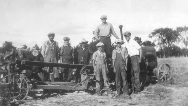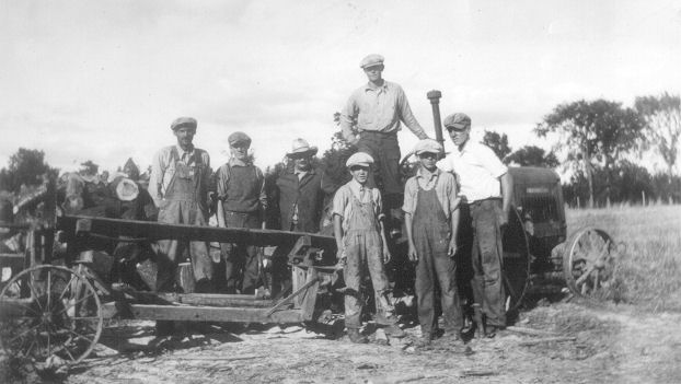 From left: Otto Johnson, Bill Maki, Bob Madsen, George Eloranta, Edwin Eloranta (standing on tractor), Walter Eloranta, and Roger Riley.