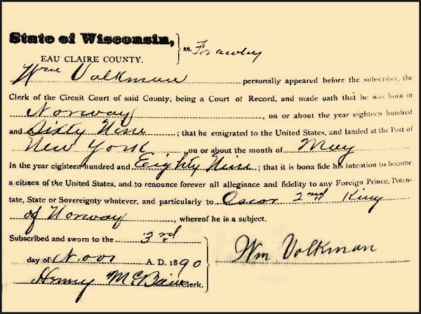 Wm Volkman 3 Nov 1890 Eau Claire, Wisconsin, United States 1869 Norway Naturalization