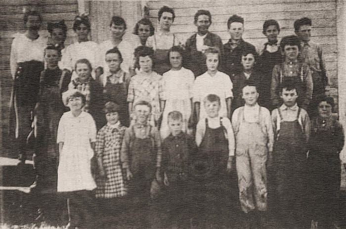 Class members of the Irving School, 1918 (front row, left to right) Susie Simmons, Norma Wisnosky, Ada Swirzinski, Raymond Simmons, Kenneth Simmons, Antone Schultz, Ell Dessloch, Frank Pachal; (middle row from left) George Schultz, Seima Sell, Emil Shefchlk, Lula Wittinger, Veronica Schultz, Violet Gretzner, Hilbert Sell, Louise Pachal; (back row from left) teacher Pauline Altenburg, Ione Hebert, Eva Gretzner, Frieda Dillman, Gladys Gretzner, Alvin Schultz, Ben Pieper, Charley Wittlenger, Arnold Pieper, Ben Dillman. |