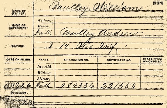 Pauley, William (Left) -- Co. I, 14th Wisc., Enlisted 11 /30 /61 and 11 /24/ 62 Died of Typhoid Fever.