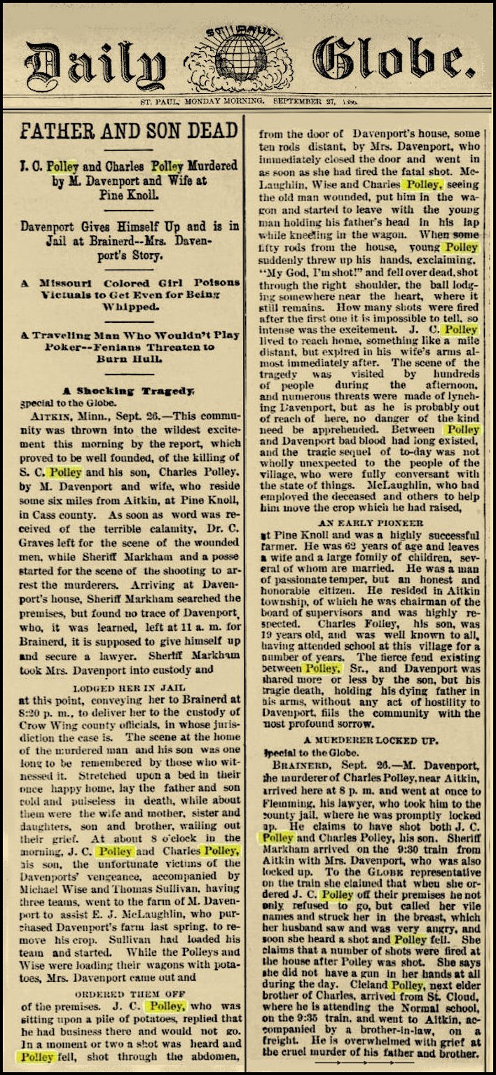 A father (John Cutter Polley) and son named (John Charles "Charlie") Polley, were killed on Sunday on a claim owned by Mrs. Davenport near Pine Knoll, Cass Co., Minn., Polley with others came on the claim with a wagon to carry off produce, which the Davenports claim was the culmination of a long series of persecutions by the Polleys to drive them from their claim. Mrs. Davenport says when she went out she found the elder Polley sitting near by on a sack of potatoes armed with a Winchester, with which be menaced her, and then abused her, using vile language, and finally struck her. Davenport says he saw Polley come up with his gun and felt sure be meant fight, as he had repeatedly fired on him and about his cabin. He says he then ran upstairs where be had two guns, and seizing his Winchester, raised the window slightly, watched Polley and heard him abusing his wife. When Polley struck her he aimed and fired. Mrs. Davenport says she heard this shot and saw them carrying Poilley into a wagon. As the wagon hurried away the men in it opened fire on the cabin, and Davenport fired two shots more, as he says, firing high to scare them away. The boy. Charley Polley, was holding his dying father in the wagon when he. too, was pierced with a ball, and both died soon after Mr. end Mrs. Davenport gave themselves up to Sheriff Matteson.