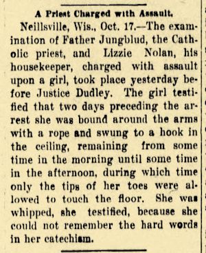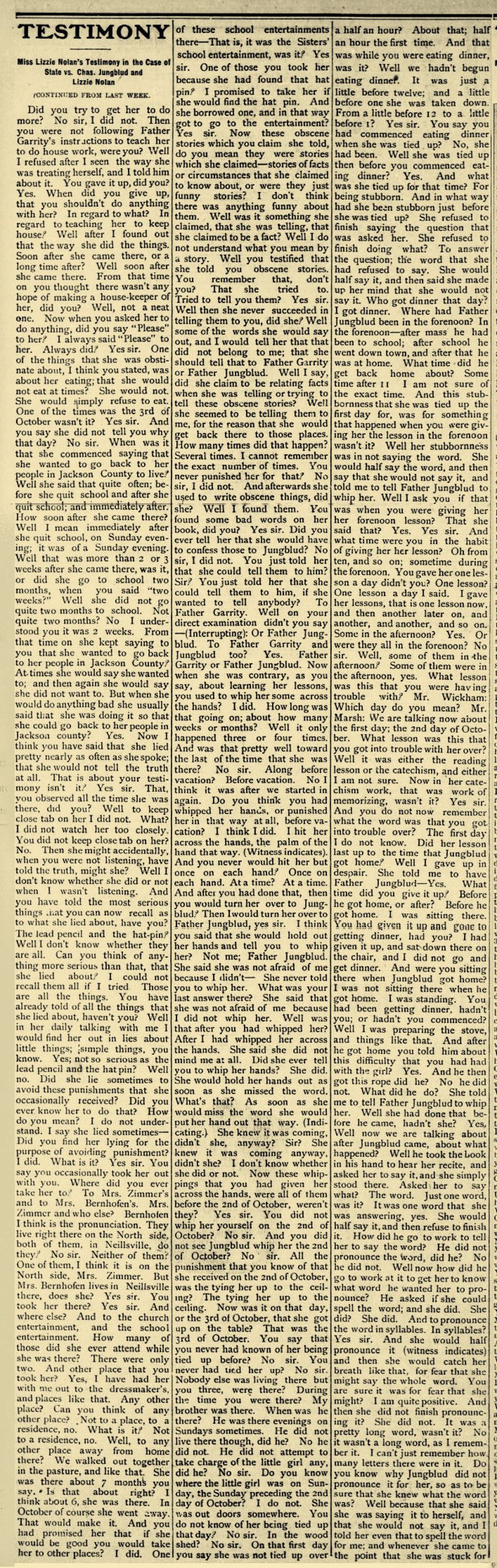 Where was Lizzie Nolan living at that time? She was living there, she was only at church. She stayed with the priest then? She was keeping house for him. Was she there keeping house for the priest when you came or did she come after you did? She was there before I came. And when you first came there to the priest house to live, whom did you find living there? Her and the priest. And did she live there all the time that you were there? Yes sir. What did you go over to Mr. Southard's house for that Friday morning? To get my dress buttoned. Where did your dress button up, in front or behind? In the back. Why didn’t you button it up yourself? I couldn’t my hands were so sore. What was the trouble with your hands? He hit them so hard the nails were off of them and it was cut in between here. (Witness indicates between lingers.) Who hit them so hard? I don’t know which one it was. Oh, they hurt so hard, what was the trouble with them? They were swollen so. What made them sore, how had you hurt yourself? By him hitting me so. By whom hitting you so? Father; the priest. This man here? Yes sir. What did he hit them with? He hit me first with a small club and then he had a big club to hit me with. Had he hit you at all that morning just before you went over to Mr. Southard’s? No sir. When was it? The night before I went. Where were you when he hit you the night before? In the kitchen. Who else was there, if anybody? Just Lizzie and the priest, What were you doing when he commenced hitting you? I don’t remember. You say you were in the kitchen? Yes sir. Where were you? Standing up or walking around or sitting in a chair, or what were you doing? I don’t remember. You remember some marks that were around your arms when you came over to Mr. Southard's that morning? Yes sir. What made those there? He tied me up by my wrists. Who tied you up by your wrists? The priest. And what did he tie you up to? A hook in the dining room, the lamp used to be on. Where was it in the side of the wall? Right in the middle of the room. On the floor? No, up in the ceiling. Was there anyone else there besides you and the priest when he tied you up to that hook? Lizzie was there. What was she doing? I don’t remember. When you were tied up to this hook in the ceiling with the rope, what did you do, that is, while you were tied up what did you do? Tried to think of the words. What words? Of my catechism. Did Father Jungblud tell you what he was hanging you up for? Lizzie told me. What did she tell you? She said I could stay there till I knew my words. How long did you stay there? I don’t remember. When were you taken down from there? At night. Do you know what day of the week it was? No. How long before that morning that you went over to Mr. Southard's was it? I don’t know. What time of day was it that you were tied up there? I don’t know what time it was. Was it in the forenoon or after noon? Forenoon. And were you taken down at dinner time? No sir. What room was this in, did you say? Dining-room. Where were you when they were eating dinner? I stayed in there too. Were you tied up then? Yes sir. Were you sitting down or standing up? Standing up. Standing down squarely on your feet were you? Just on my tip-toes. Why didn’t you stand down squarely on your feet? Because I couldn’t. Why couldn’t you? I was tied up too high. Did anybody else eat dinner there with them that day? No sir. Did either Father Jungblud or Lizzie talk to you while you were there, while they were eating dinner? They said it was fun for them to see me hanging there. Who said that? Lizzie said that. Did you remember the words then? I said one after I thought of it. When did you think of that? When Father Jungblud started down town. Was it when you were hanging up, or afterwards? When I was hanging up. Do you remember what the word was now? No sir. What did Father Jungblud do then when you thought of the word? Came back and took me down Then I washed the dishes for them. Were your hands sore then? Yes sir. Is there a scab there on your hand, now? Yes sir. (Referring to the hand) Was this sore then when you were taken down, or wasn’t it? No it was done the night before I went down. The night before you went where? Down to Southard’s. This was done the night before you went down to Southard’s, between your two lingers? This was (indicating) too. The thumb nail was injured the night before you went down to Southard’s? Yes. You didn’t wash any dishes after your nail was off? No sir. Was that nail off, or wasn’t it? Clear off. The nail off from that thumb? Yes sir. How did that come off? I don’t know which one knocked it off. Do you know whether it was done when you were hanging up or when you were not hanging up? I don’t know. Who was there when it was knocked off? Just Lizzie and the priest. What were they doing when it was knocked off? Whipping me. I don’t know when it was knocked off. Do you know which one was doing the whipping when it was knocked off? No sir. Do you know which one was doing the whipping, if either one, when that was hurt between the two lingers? No sir. Do you know whether or not both of them were there at that time, at the time you were hurt between the fingers? I don’t know. You say both of those things were done the night before you went down to Mr. Southard’s is that right? Yes sir. Was it before dark or after dark? It was after dark. Well don’t you know whether it was after you were taken down, after the rope was taken off of you, or before? No sir. Well were you whipped any while you were tied up with the rope? Yes sir. Were you or weren’t you whipped any after you were taken down, after the rope was taken off? I wasn’t whipped any that morning. What morning do you mean? The morning that I went away. How did you go out of the house that morning when you went over to Mr. Southard’s? Through the window. Why did you go through the window? Because I couldn't get out through the door