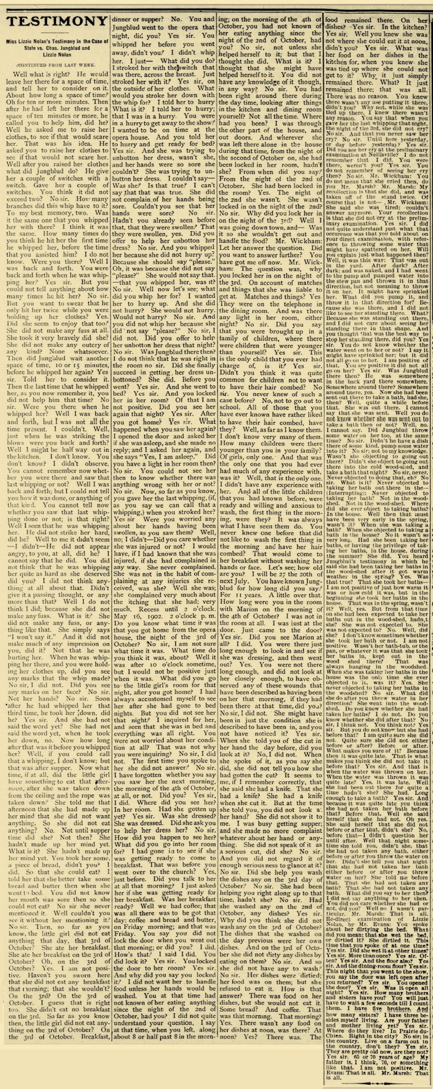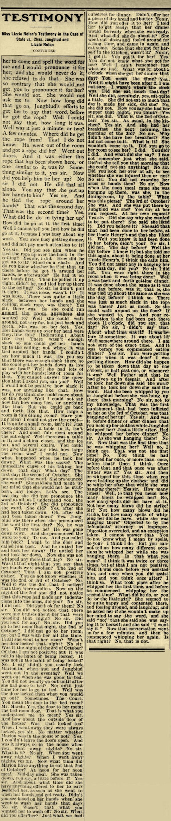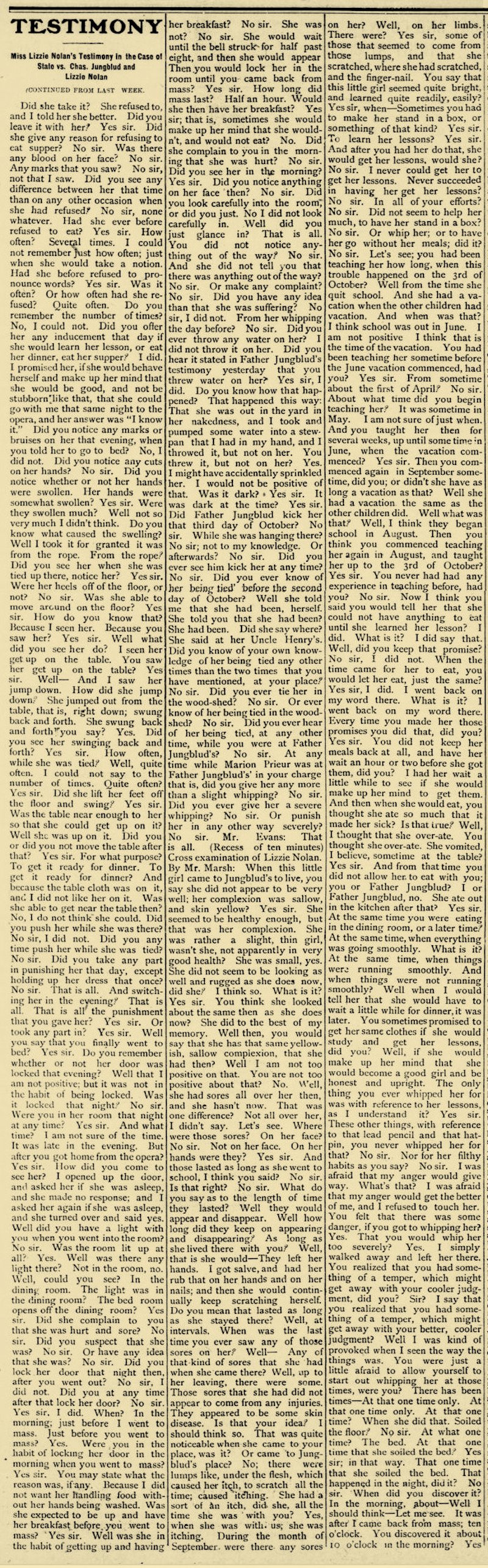 Did be tell you any reason for kicking you? No sir. Where was Lizzie then? She was in the dining room too. What was she doing? She was hitting me with a stick. What was she hitting you for? Because I couldn't button up my dress. Why couldn’t you button up your dress? My bands were so sore. Why didn't you have her button up your dress? She wouldn’t button it. Was that after dark or before dark? After dark. Was that before you went over to Southard's? Yes sir" How many before? Night before. Do you remembered how long you stayed there at Mr. Southard’s? No sir. Do you remember after a while you were taken up to Mr. or Mrs. Campbell's? Yes sir. Do you remember who took care of you at Mrs. Southard's? Miss Finnegan. Do you know how long that was sore in your left side when you were kicked? No sir. Which was the sorest place for the longest, if yon know; that place or your hand where it was hurt. This on my finger. When Lizzie was holding up your dress that day and Father Jungblud was whipping you, what kind of a whip did he use? I can’t remember. Where did he whip you? Everywhere he could. What kind of a rope were you tied up with? Small rope. About I how large was it? It was a big long, rope, about as big as my little finger, I Do you know what it had been used for at any time? It was used for a clothes-line. Do you know what else It had been used for, aside from clothes-line, if anything? And the rope that was around my trunk. Where was this rope kept in the house, if you know? It was kept out doors on the line. Do you know where it was gotten from, when you were first tied up with it? Yes sir. it was out doors hanging up. Who got it? Father Jungblud. How did he get up to the ceiling to get it over that lamp hook? Got on a chair. How many sleeping rooms are there on the lower floor of that house? Just mine and another bed room. Whose room was the other one? I don’t know. What side of the house was that on? That was on the other side of my room: my room comes, and then his room—that next room comes. Now whenever they were whipping you. or tying you up, at these times that you have spoken of, did they tell you at any time what they were doing it for? I don't remember. You say you knew what they were doing it for; now, how do you think you knew unless they told you? Because I wouldn’t know the words, and she would whip me for them. Which side of the house is your room on? The north side. And which side of your room, was this other sleeping room on the ground floor? South. Was it across a hall way, this other sleeping room, from your room? No sir, my wall and his wall. Oh, I see, just a wall, between your room and this other sleeping room? Yes sir. Was yours the only sleeping room that opens into the dining room? Yes sir. And which side of the dining room was it? In the corner. The door through which you go out of the dining room into your room, is that on the west side of the dining room or on the north side? West side. You say you occupied that room all alone, do you? Yes sir. Nobody else slept there. And you don't know whether you had seen Father Jungblud or Lizzie Nolan after you went to bed that night? No sir. I mean after you went to your room that night? No sir. Until you went over to Mr. Southard’s the next morning? No sir. You said when Father Jungblud was starting down town you remembered the word? I thought of it. You thought of it, and what did you do? I told Lizzie and then she called him back and he took me down and I washed the dishes. Did he go down town then if you know? Yes sir. Go away somewhere? He went down town again. Did Lizzie go down town do you know, either of those two nights? I don’t remember. Did she go to your room, late at night, either of those two nights, before you went down to Mr. Southard’s. I don’t remember. Lo you remember of their going away just about that time, and telling you one night where they were going? No sir. Do you remember of being left alone, during the evening, either of those nights? No sir. Mr. Marsh: That is all.