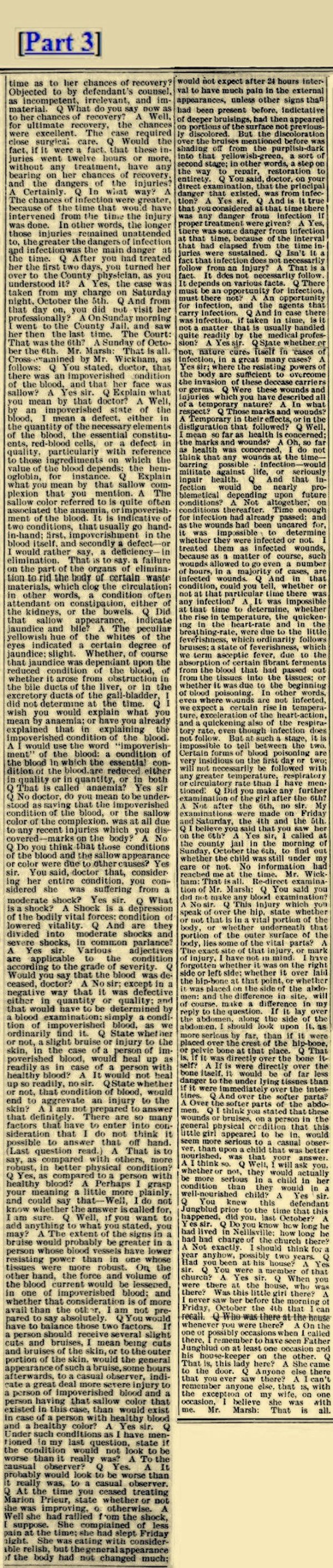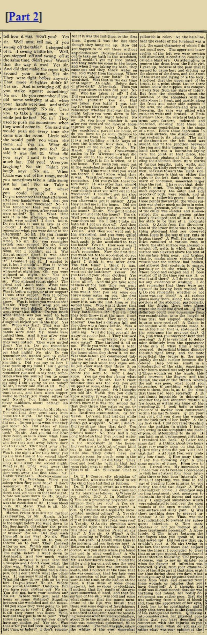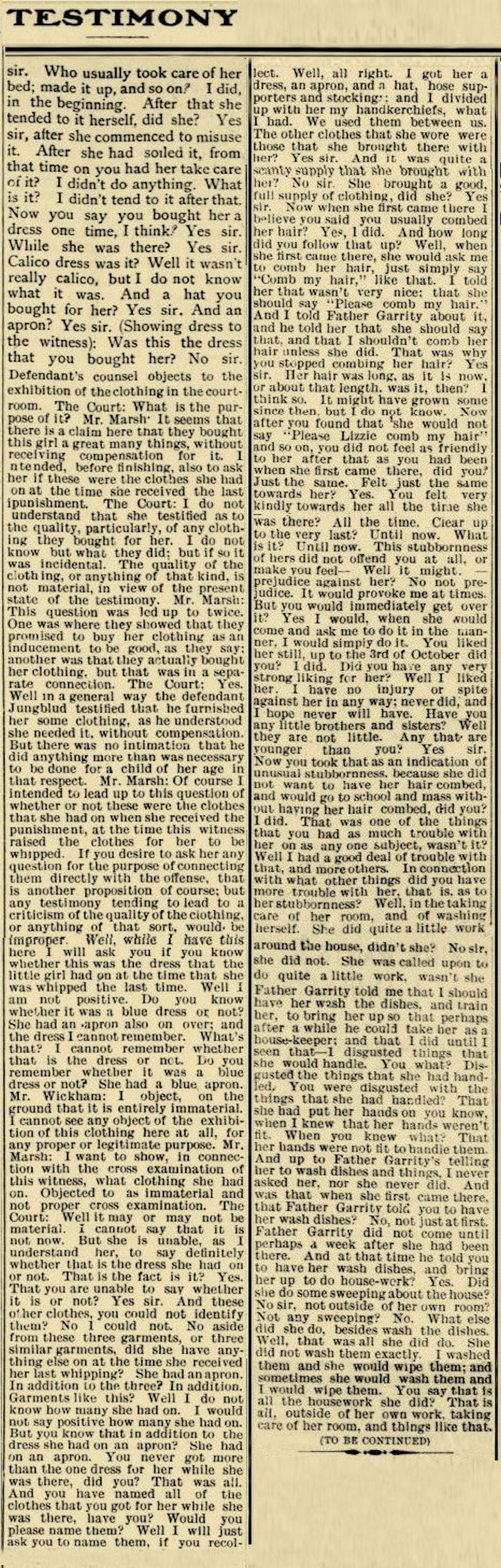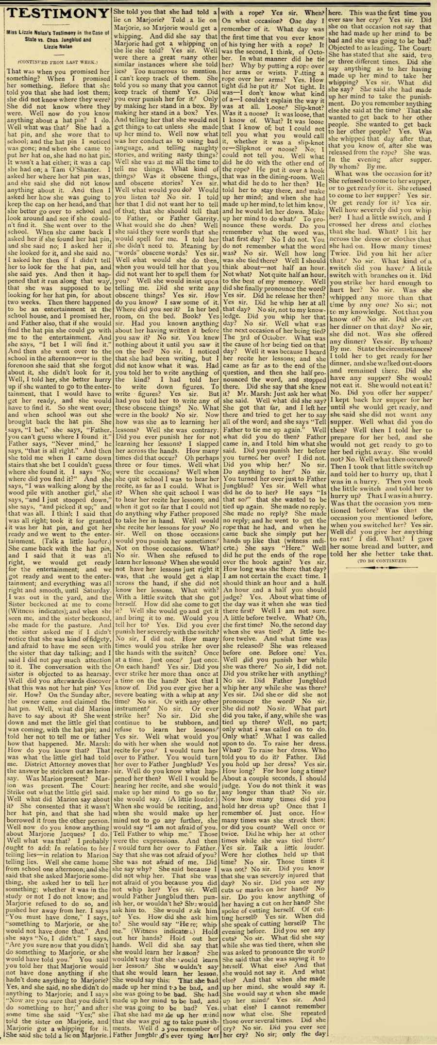 Did be tell you any reason for kicking you? No sir. Where was Lizzie then? She was in the dining room too. What was she doing? She was hitting me with a stick. What was she hitting you for? Because I couldn't button up my dress. Why couldn’t you button up your dress? My bands were so sore. Why didn't you have her button up your dress? She wouldn’t button it. Was that after dark or before dark? After dark. Was that before you went over to Southard's? Yes sir" How many before? Night before. Do you remembered how long you stayed there at Mr. Southard’s? No sir. Do you remember after a while you were taken up to Mr. or Mrs. Campbell's? Yes sir. Do you remember who took care of you at Mrs. Southard's? Miss Finnegan. Do you know how long that was sore in your left side when you were kicked? No sir. Which was the sorest place for the longest, if yon know; that place or your hand where it was hurt. This on my finger. When Lizzie was holding up your dress that day and Father Jungblud was whipping you, what kind of a whip did he use? I can’t remember. Where did he whip you? Everywhere he could. What kind of a rope were you tied up with? Small rope. About I how large was it? It was a big long, rope, about as big as my little finger, I Do you know what it had been used for at any time? It was used for a clothes-line. Do you know what else It had been used for, aside from clothes-line, if anything? And the rope that was around my trunk. Where was this rope kept in the house, if you know? It was kept out doors on the line. Do you know where it was gotten from, when you were first tied up with it? Yes sir. it was out doors hanging up. Who got it? Father Jungblud. How did he get up to the ceiling to get it over that lamp hook? Got on a chair. How many sleeping rooms are there on the lower floor of that house? Just mine and another bed room. Whose room was the other one? I don’t know. What side of the house was that on? That was on the other side of my room: my room comes, and then his room—that next room comes. Now whenever they were whipping you. or tying you up, at these times that you have spoken of, did they tell you at any time what they were doing it for? I don't remember. You say you knew what they were doing it for; now, how do you think you knew unless they told you? Because I wouldn’t know the words, and she would whip me for them. Which side of the house is your room on? The north side. And which side of your room, was this other sleeping room on the ground floor? South. Was it across a hall way, this other sleeping room, from your room? No sir, my wall and his wall. Oh, I see, just a wall, between your room and this other sleeping room? Yes sir. Was yours the only sleeping room that opens into the dining room? Yes sir. And which side of the dining room was it? In the corner. The door through which you go out of the dining room into your room, is that on the west side of the dining room or on the north side? West side. You say you occupied that room all alone, do you? Yes sir. Nobody else slept there. And you don't know whether you had seen Father Jungblud or Lizzie Nolan after you went to bed that night? No sir. I mean after you went to your room that night? No sir. Until you went over to Mr. Southard’s the next morning? No sir. You said when Father Jungblud was starting down town you remembered the word? I thought of it. You thought of it, and what did you do? I told Lizzie and then she called him back and he took me down and I washed the dishes. Did he go down town then if you know? Yes sir. Go away somewhere? He went down town again. Did Lizzie go down town do you know, either of those two nights? I don’t remember. Did she go to your room, late at night, either of those two nights, before you went down to Mr. Southard’s. I don’t remember. Lo you remember of their going away just about that time, and telling you one night where they were going? No sir. Do you remember of being left alone, during the evening, either of those nights? No sir. Mr. Marsh: That is all.