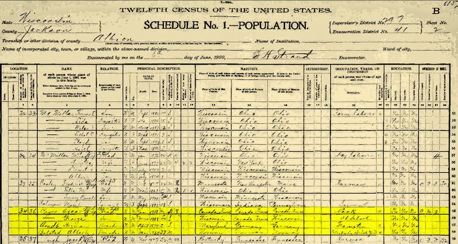 George Pryor 1900 Male 12 Single White Jun 1888 Wisconsin Canada French