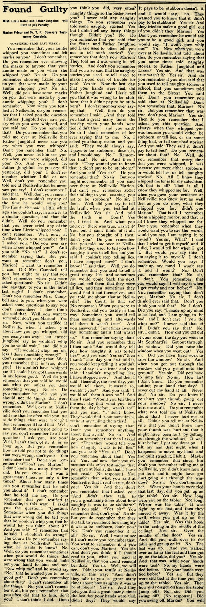 Did you swing off, Marion? You will tell how it was, won’t you? Yes sir. Well now, tell me, if you swung off the table? I stepped off of it, I swung a little bit. Well, you stepped off and swung off at the same time, didn’t you? Wasn’t that the way it was? Yes sir. And did that make the ropes tight around your arms? Yes sir. They were tight before anyway. That made it tighter didn’t it? Yes sir. And in swinging off, did you strike against something? No sir. Do you remember if you did some swinging at all, when your hands were tied, and strike against anything? No sir. Used you to take a swing once in a while just for fun? No sir They used to push me sometimes when they would come in. She said she would push me every time she came into the room. Lizzie said she would push you when she came in? Yes sir. What did she want to push you for? She said it was fun to. What did you say? I said it isn’t very much fun. Did you? Were you laughing? No sir. Didn’t you laugh any? No sir. When Lizzie was out of the room, would you sometimes take a little swing just for fun? No sir. Take a run and jump, get where you could jump? No sir. Do you remember that that afternoon, after your hands were tied, that you wont out in the woodshed? No sir. You remember that you went out doors that afternoon, after your hands were untied? No sir. What time was it in the afternoon when your hands were untied? I don't know. Do you think it was as late as one o’clock? I don’t know. Don’t you remember what you were doing in the afternoon? No sir. Do you remember what you were doing I at supper time? No sir. Do you remember eating your supper? No sir. They gave me some bread and butter in my room, but I couldn’t eat it. Was that at supper time? It was after supper time. Didn’t you want to cat it? I couldn't eat it. I wanted to eat it but I couldn’t. Was it before that that you were whipped? I was whipped at night too. Ob. you were whipped at night too? Yes sir. After your hands were untied? Yes sir. Who whipped you at night? The priest and Lizzie both. What time at night? I don’t know what time. Was it before supper, or after supper? It was after supper. Was it before you came in from out doors? I don’t know. Was it before you went to bed? Yes sir. They didn’t whip you any after you went to bed? No sir. They went away that night. Do you know what time it was you went to bed? No sir. Do you say that Father Jungblud kicked you in the hip? Yes sir. When was that? That was the same light. Was that when your hands were tied? My hands were untied then. And it was after your hands were tied? Yes sir. After they were untied. They were untied then? Yes sir. Do you remember Lizzie tried to get you to come to sup per that night? No sir. Do you remember she wanted you to come? No sir, she never did. Didn't she? She didn’t. Did you say to her: I have made up my mind I ain’t going to eat, and I won’t? No sir. Do you remember you used to say that, some times when she wanted you to come to supper? No sir. I have made up my mind I ain’t going to eat today? No sir, I never said that at all. Weil, you remember sometimes you used to want to eat, and then when supper would be ready, you would refuse to eat? No sir. You think you were never stubborn, about eating? No sir. I wasn’t.
