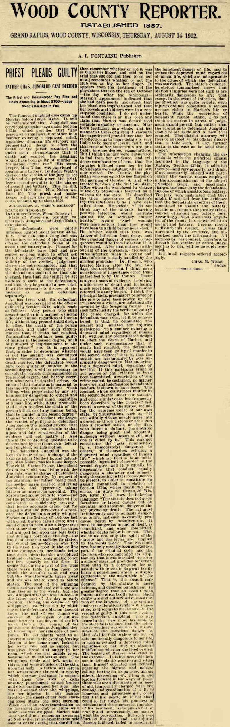 ----Source: Wood County reporter, (Grand Rapids, Wis.), May 22, 1902; Wood County reporter, (Grand Rapids, Wis.), May 29, 1902; Wausau pilot, June 03, 1902; October 24, 190; Abilene weekly reflector (Abilene, Kan.); Wood County reporter, June 05, 1902