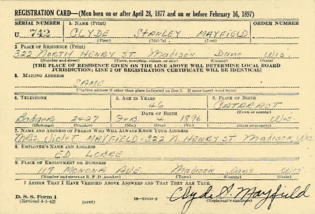 Clyde Stanley Mayfield was born 4 Feb 1896 in Little Falls, Monroe, Wisconsin and died 6 Apr 1966 in Sherman Oaks, Los Angeles, California. He was the son of George E. and Emma (Casey) Mayfield.