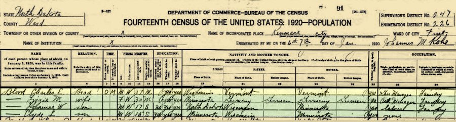 By 1920, he had moved on to Kenmare City, North Dakota and was married to Louise Marie Mahnke (1884-1965) and had two step-sons, Lawrence W. Rogar Bogar (1903) & Clyde L. Bogar (1905). She was born in Meeker, MN, 17 May 1884. They lived on First Ave. East, not far from the St. Agnes Academy. Charles was the proprietor of a laundry where his wife and both sons also worked. Their son, Clarence Robert Bogar (1907) was also living with them.