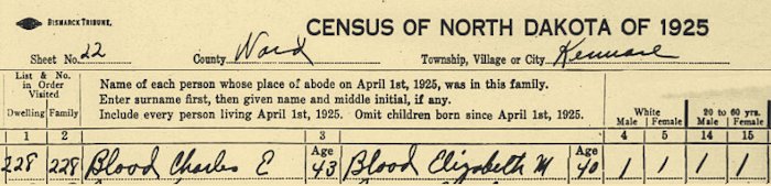 Household Members: Charles E Blood 37 Head; Lizzie M Blood 35 Wife; Lawrence W. 17 Son & Clyde L 15 Son.