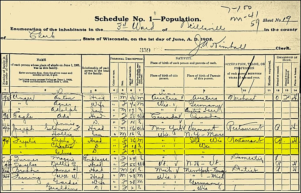 Orpha J Fryslie, a 36 year old (b. 1869) white female, was living in Neillsville, Wisconsin when the 1905 State Census (Household Identifier 63253502, Line # 31, Pg # 359) was recorded. She was born in Illinois and was the head of the household which included two daughters, thirteen year old Kjersty, who was named for her father's mother, and nine year old Selma. Both of them were born in Wisconsin. Twenty-four year old Maggie Turner also lived with the family doing domestic work for them. She too was born in the Badger state. Orpha worked in a restaurant as did her next door neighbor, Solomon Johnson (56 yrs. old) who had a sixteen year old daughter named Hollie. On the other side of their residence was the home of a local dentist, James Brooks, who was born in Michigan and was 34yrs. old