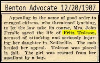 In December, 1907, Christmas lights had been strung along Hewett Street and trees were decorated inside homes with colorfully wrapped gifts placed beneath them. The church choirs were delivering the memories of our savior and no one was expecting a storm to hit. But one struck the Fryslie rooming house. It was not caused by wind or snow but resulted from a harsh blast of fear and anger. Fifteen year old Kjersty Fryslie felt the unwelcome aggression of a 28 yr. old mmigrate from Aalborg, Denmark--Fritz Thedesen. Only by the grace of God was she freed from his possessive grasp when a local boy was able to stop this 5 1/2 ft. tall, blue-eyed, blonde haired, heavy set pedophile in the midst of his attack. A group of enraged citizens were ready to lynch the wretched grinch, but Orpha's heart would not have it. She convinced the mob to let the law take its course and they reluctantly backed off in honor of her pleas. When the incident was reported in the newspaper, Kjersty's mother was credited with actually saving the life of her daughter's attacker. Instead of being hung in the Neillsville town square, a jury found him guilty and he became an inmate in the State Prison in Waupun, Wisconsin where he was put to work in the Knitting Mill. He would not be forcing himself on yet another innocent victim. After serving his term, he, he did not return to Clark County.