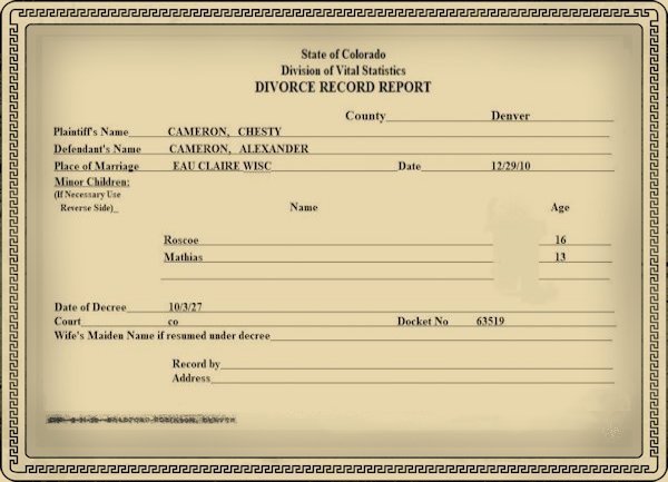 It was there, in Taylor county, close to both the Upper Peninsula of Michigan and the Canadian border, that Alexander Cameron first met Kjersty . He had come to the United states with his parents when he was five years old and was working in the saw mill and staying at the Fryslie's new boarding house. They were married in Eau Claire, Wisconsin 29 Dec 1910 and became the parents of two sons born two years apart, Roscoe Alexander Cameron, (14 May 1911 in Benton Co., MN–21 Mar 1965 in Alameda, CA) and Mathias Perry Cameron (20 May 1913 in Wisconsin–25 Sep 1981 in Alameda, CA). Sadly 3 Oct 1927 their marriage ended in divorce.