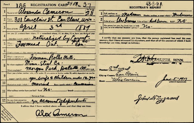 Alexander Cameron, 28 yrs. old, living at 308 Eau Claire St., Eau Claire, Wis. who was born in
