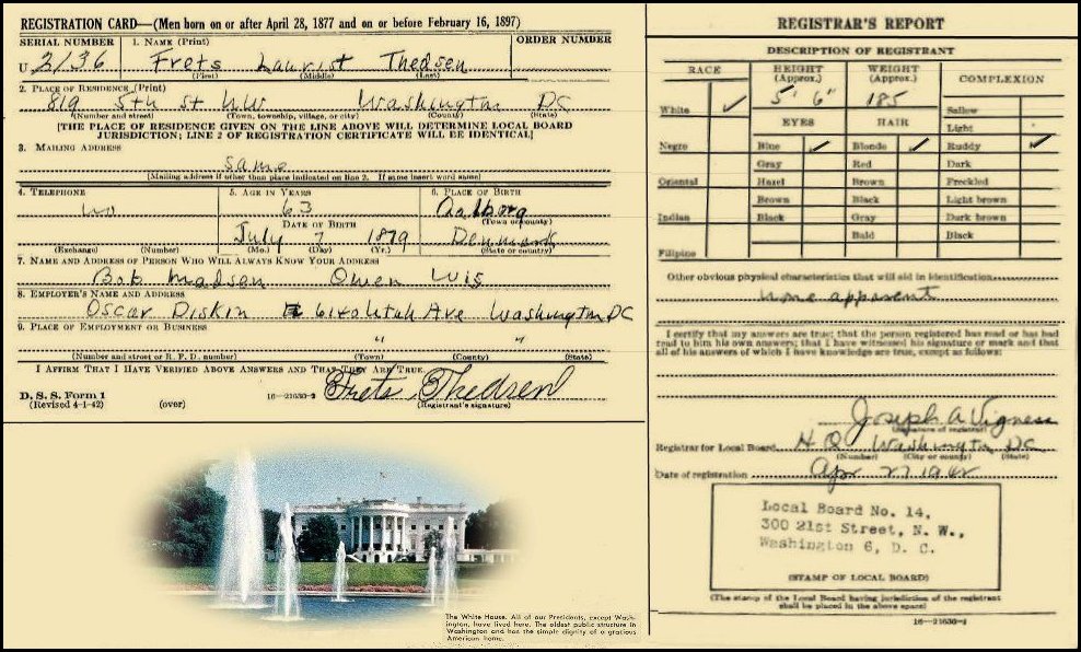 Frets / Fritz Laurist Thedsen was born in Aalborg Denmark 7 July 1879 and was living at 819 5th St. NW. in Washington D. C.