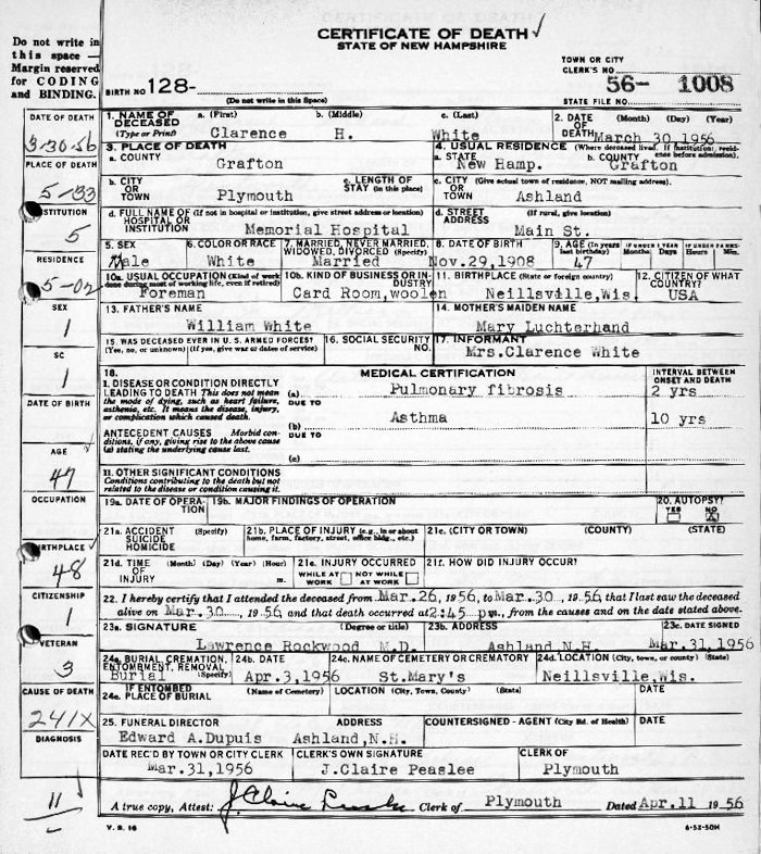 the son of Mr. and Mrs. W. H. White of Neillsville. He grew to manhood here, completed two years of high school and has since worked with his father at the barber trade. His wife to be, Albertine Marie Barton, graduated from Neillsville high school in 1928 and the next year from the teachers training department. When the 1930 Federal Census was taken, he was 21 yrs. old. The Great Depression had hit. Albertine was 19 and lived with her parents in Weston Twp., Clark Co., Wisconsin where she taught at the Weston rural school. Clarence was a boarder at the Arthur Barton residence where he helped with the farm work. Despite the onset of the "Great Depression, he and Albertine Barton were married Nov. 25, 1931. By the time the 1940 Federal Census was taken, they were living in Superior, Douglas Co., Wisconsin and 32 yr. old Clarence was employed as a salesman (cash wagon, tobbacco and sundry). Albertine was twenty-nine and teaching in the Superior City School System. In 1952, when his mother passed away, Clarence was living in Ashland, N. H where he was a foreman in the card room of a woolen mill. March 30, 1956 at 2:30 pm while rain and melting snow fell on the busy streets outside Memorial Hospital, his script for this life came to an end. He was forty-seven years old. He died of Pulmonary Fibrosis which had plagued him for 2yrs. and was complicated with a ten year battle with asthma. His death certificate was signed by Dr. Lawrence Lockwood who had watched over him for his last four days of life.