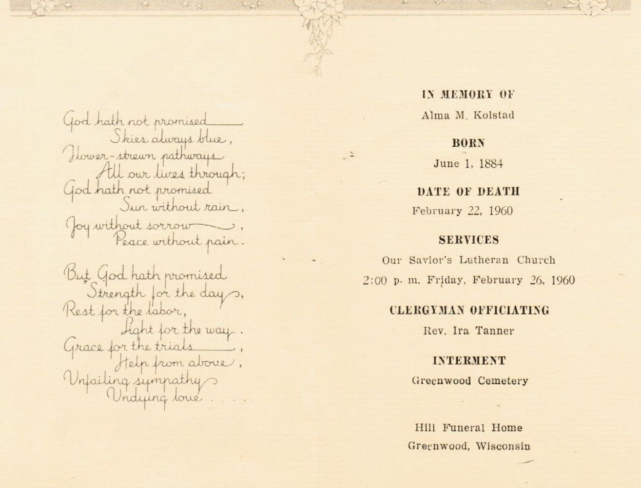 Obit: Kolstad, Alma Margaret (1884 - 1960)