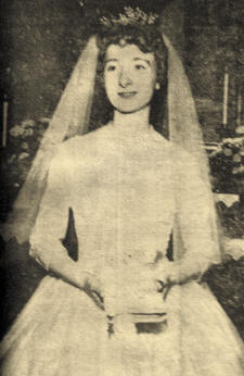 The bride, a student at Marquette University in Milwaukee, approached the altar on the arm of her father. Her bridal gown was of embroidered silk bombazine over net and taffeta, with Basque bodice, a portrait neckline trimmed with pearls and sequins, and three quarter length, fitted sleeves. The very bouffant skirt, with embroidered panels, extended from the bodice into a chapel train. The fingertip veil was of imported silk illusion attached to a Princess crown trimmed with rhinestones.