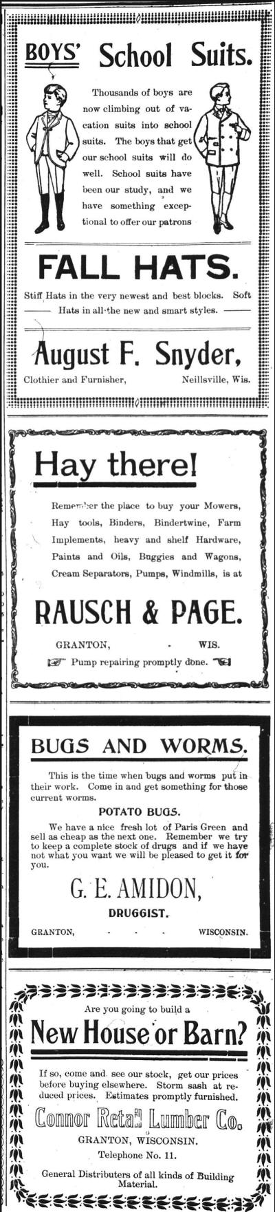 ----Source: THE GRANTON NEWS, VOLUME II, No. 10, GRANTON, WISCONSIN, FRIDAY, SEPT. 1, 1905.