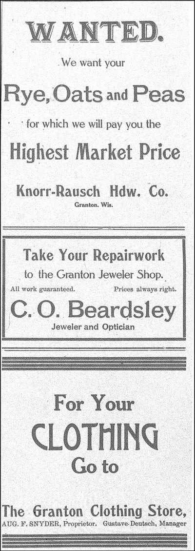 Advertisers: Wm. Ebbe, Auctioneer; J. R. Bladl Harness Shop;Connor Retail; Farmers State Bank; Davis & Mahn Barber Shop; C. C. Sniteman Co. Drug Store; Amidon's Drug Store; Knorr-Rausch Hardware Co.; C. O. Beardsley, Jeweler & Optician; Granton Clothing, Aug. F. Snyder, proprietor and Gustave Deutsch, Manager.