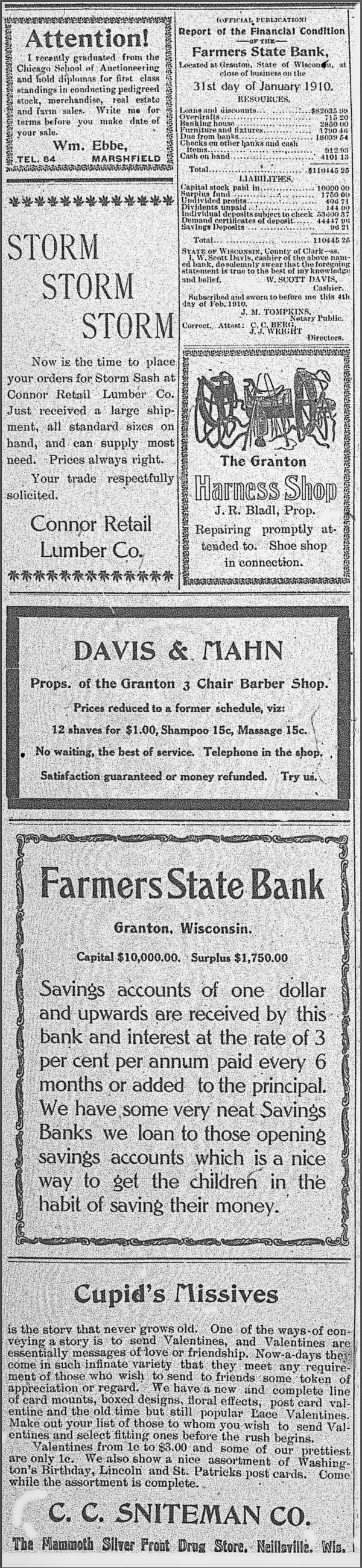 ----Source: THE GRANTON NEWS, VOLUME VI, No. 33, GRANTON, WISCONSIN, FRIDAY, February 11, 1910.