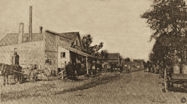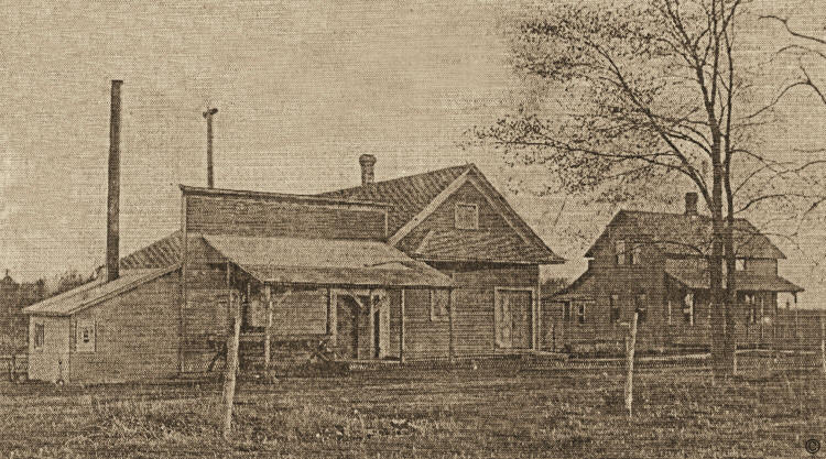 | This old time post card was sent to the Thorp Courier, Thorp, Wis. by Dean Micke Stanley. Considering the house next door, it appears that this was a small family-run business. The unique smoke stack on the left matches up with the photo below which is known to be the Cloverleaf Cheese Factory. |