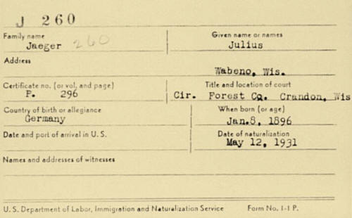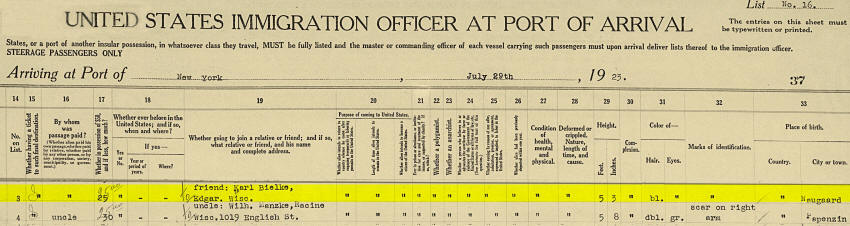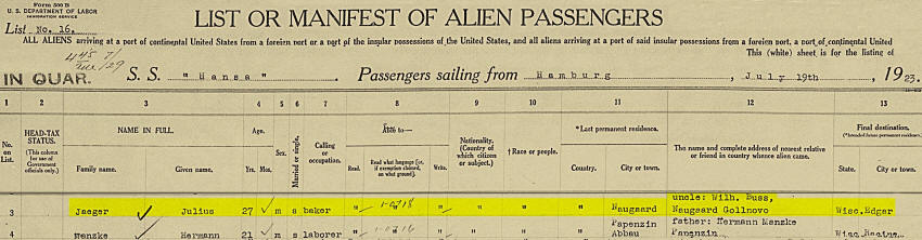 Julius Jaeger Immigration 29 Jul 1923 Ellis Island, New York City, New York, United States Naugaard, Germany Male 27 Single Germany, German 1896 Hamburg "Hansa" Germany Informant: Wilhelm Buss of Naugaard Gollnovo headed to Edgar, Wisconsin Never before in USA Friend: Karl Bielke, Edgar, Wisconsin 5"3" tall, fair complexion, black hair, blue eyes, no distinguishing marks.