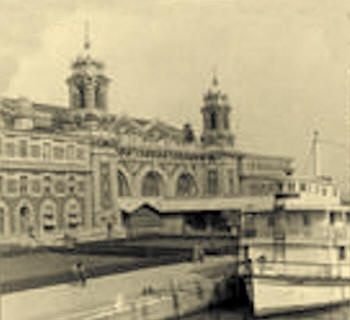 Immigration station, Ellis Island, N.Y. Ferry docked by main building. |