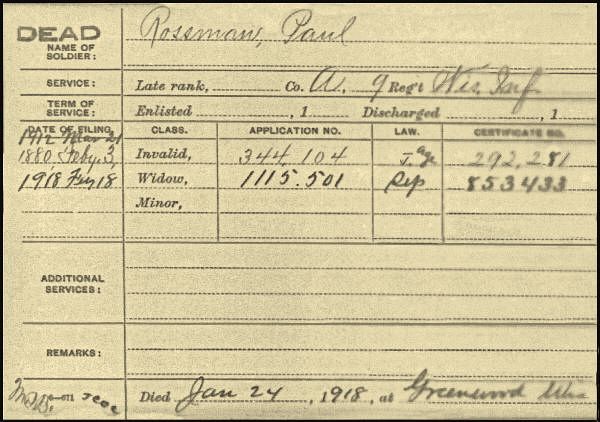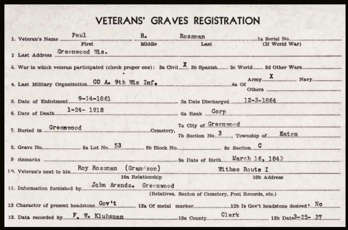Paul Rossman Carpora A. 9 Wis. ?Ft. Sept. 14, 1861 Dec. 2 1864 3 Years, 2 months , 18 days.