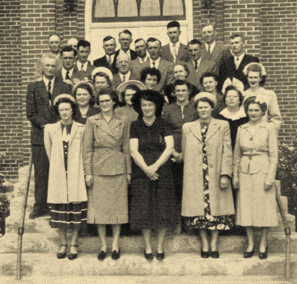 THE YOUNG ADULT FELLOWSHIP 1st Row: The Mesdames Clarence Meinhardt, Harry Liebzeit, Phillip Vollrath, Erwin Toburen, Quinten Irvine. 2nd Row: Delmar Toburen, George Kuester, Norman Liebzeit, Walter Schwarze, J.C. Klingeberger, Alvin Albert, Arno Miller, Fred Timmler, Arvin Liebzeit. 3rd Row: Messrs George Kuester, Norman Liebzeit, Delmar Toburen, Rev. J.C. Klingeberger, Arvin Liebzeit, Quinten Irvine, Clarence Meinhardt. 4th Row: Fred Timmler, Alvin Albert, Arno Miller, Harry Liebzeit, Walter Schwarze, Erwin Toburen, Phillip Vollrath.