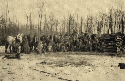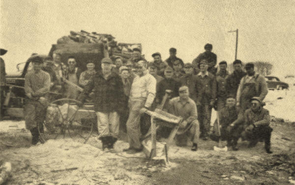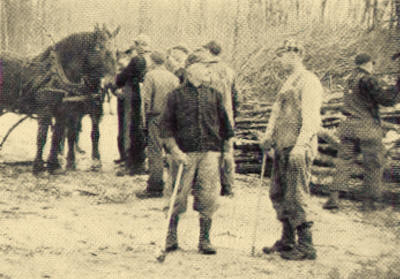 The pictures of our men busy in the woods, cutting the firewood for Church, school and parsonage, were taken during the year of 1950. Forty-two men responded to the call to cut the smaller trees and the large treetops so the limbs could be piled up for sawing. Three power chain saws were kept busy cutting trees and tops which had been trimmed by the woodsmen in the woods belonging to Simon Boedeker, and now the property of his granddaughter and her husband, Mr. and Mrs. Bernard Novobilski. Four teams skidded the tops and trunks to the pile which was being made ready for sawing the wood into 16 and 24 inch lengths. On the following day came the sawing outfit and a crew of 24 to feed the tree limbs and trunks into the saw and load same on trucks to be hauled and piled at the parsonage and church. The men enjoy this work; it bids them recall the work of yesteryears. And cutting 80 cords of wood spell quite a saving for the church treasury; it all helps to pay the budget.