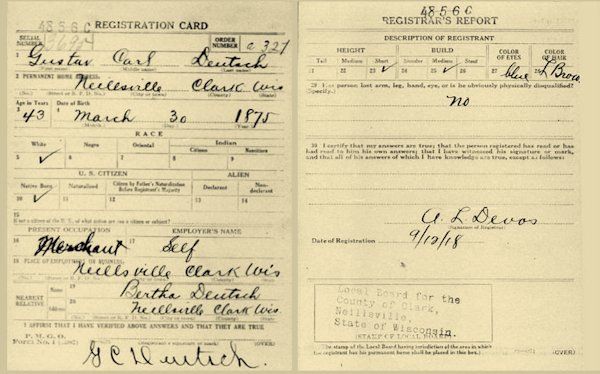 Gustave Carl Deutsch was born 30 March 1875, in Neillsville, Clark, WI, United States. He married Bertha M. Goebel, July 29, 1913, in Granton, Wisconsin. When he passed away just before Christmas in 1965, he was buried in the Neillsville, WI City cemetery.