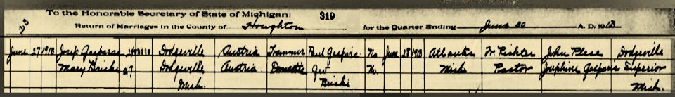 Marriage of Jack & Mary Briski Gasparac--28 Jun 1913, Houghton Co., Michigan