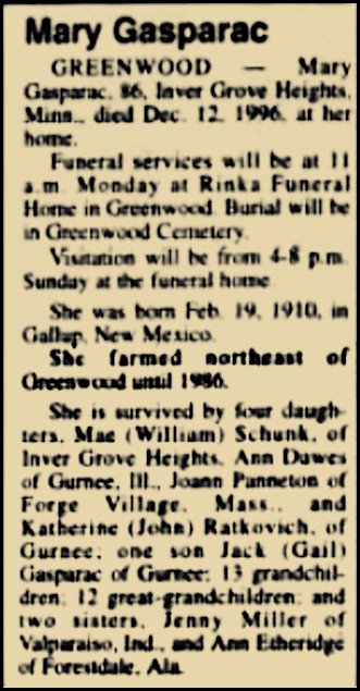 Mary Gasparac of Inver Grove Heights, Dakota County, Minnesota was born on February 19, 1910, the daughter of 25 yr. old Joseph F. Briski and his 19 yr. old wife, Mary Zagar. She died at the age of eighty-six on December 12, 1996.