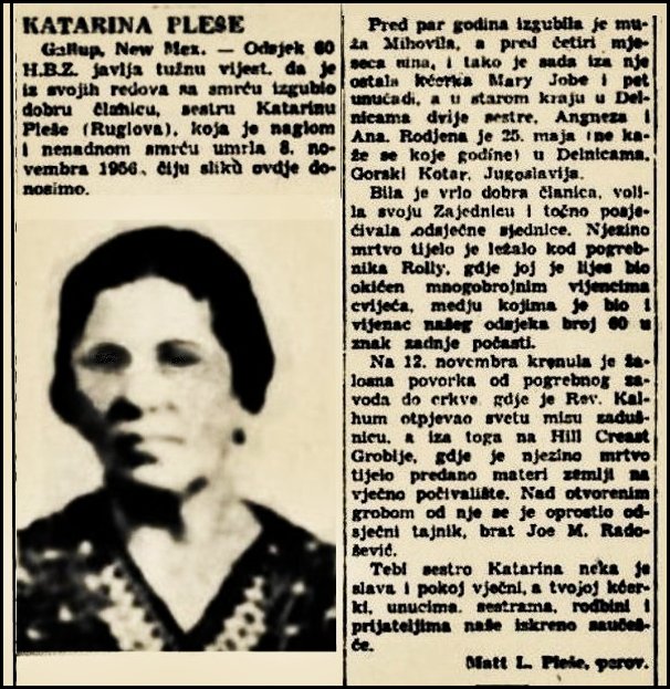*Josephine was married to Jake Gasparac's brother, John “Ivan” Gasparac Gasparich, b. 17 May 1888 in Delnice, Grad Delnice, Primorsko-goranska, Croatia; d. 18 Dec 1934 at the age of 46. He was also buried in the Hillcrest Cemetery, Gallup, McKinley County, New Mexico, USA, bk 7 row 10 gr 84.