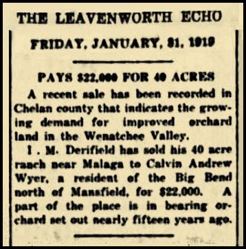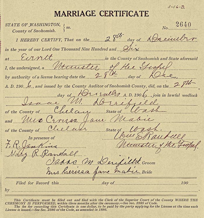 Cerissa Jane Preston Mabie Derifield died in Wenatchee, Chelan Co., WA. Her first husband was John Mabie (13 Oct 1874) in Clark Co, WI at the age of sixteen. Her second one was Isaac Derifield who she married 28 Dec 1906, while living in Everett, WA.
