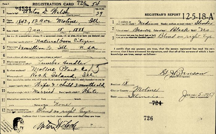 Emelia had married Anton D. Welsh, 8 June 1916 in Rock Island, Illinois, United States. They lived at 1842, 12th Ave., Moline, IL where he worked as a lumber handler for Moline Plow Co. of Rock Island, Ill. At the time of the WWI draft, it was noted as having a medium height, slender build, with brown eyes (blind in the right one) and black hair. they had a 3 month old child, Richard W. (1 Mar 1917–10 Aug 1998 in Minneapolis, MN) at the time. The following year, Eugene Welsch 1918–1918 was born. Robert J Welsch 1920–?; Fred Daniel Welsch 5 May 1924–28 Apr 1995 completed their family.
