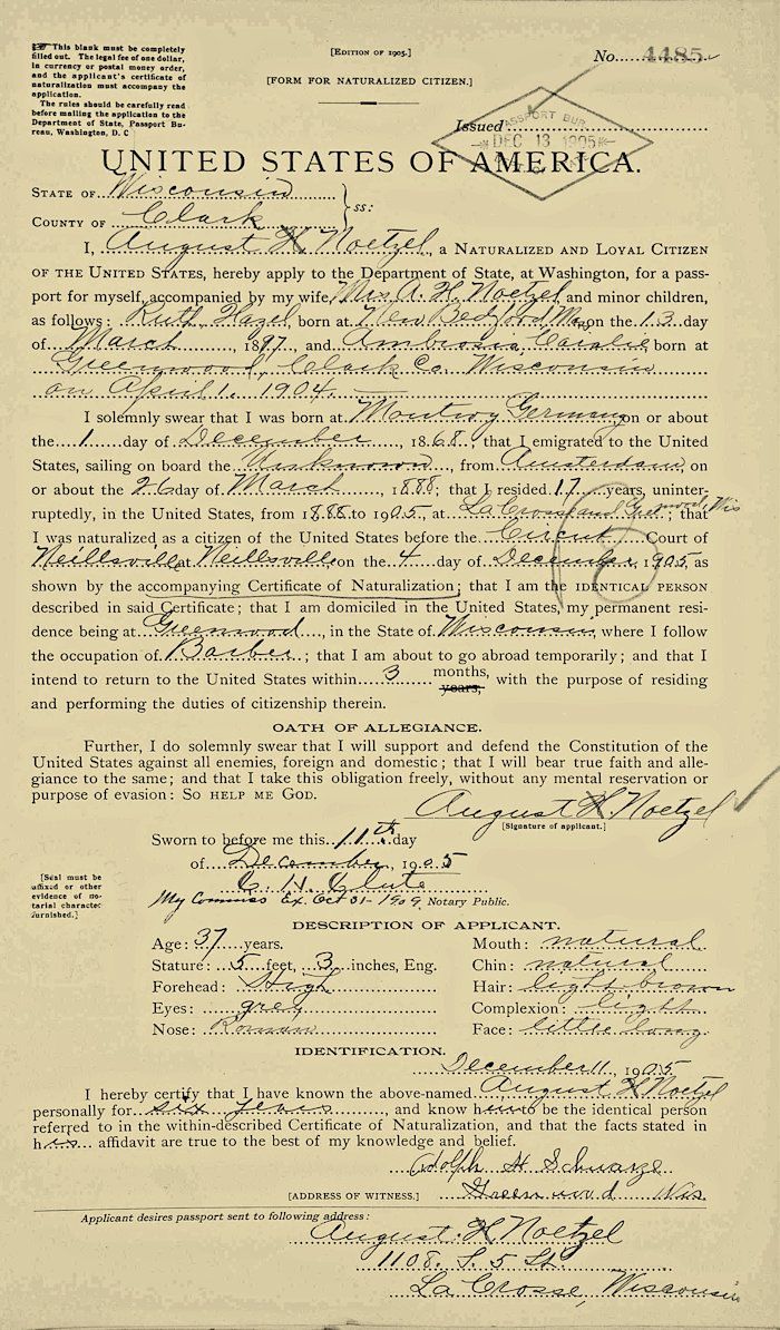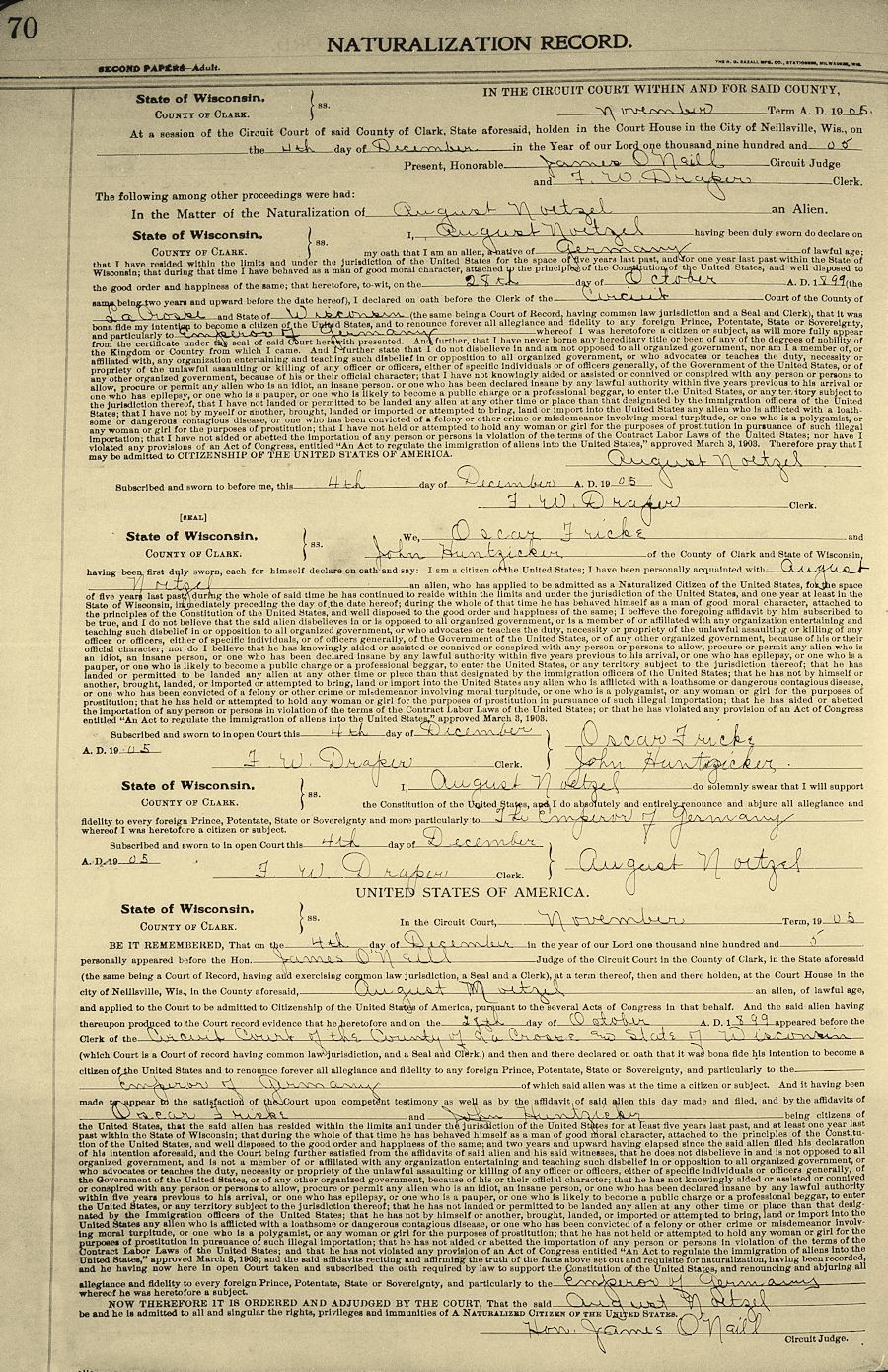 Groom: August Noetzel, 28 yr. old male, born in Germany, barber