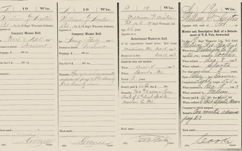 1863 December - from Sparta, enlisted in Wisconsin Infantry, Co. C, 19th Regt.