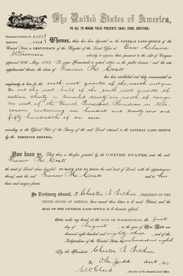 M. Francis Coats was born in 1827 in Alleghany Co. PA. He fought as a Pvt. in Co. D, 11th WI. He and his wife, Eleanor (b. 1828, PA) were farming in Eaton Twp., Clark Co., WI when the 1880 Census was taken. At that time, their household consisted of their sons: Benjamin (b. 1856) and Elijah (b. 1867); daughters: Eliza Coats (b. 1867, twin of Elijah) and Anna Greenfield (b. 1854); granddaughters: Martha Rigsby (b. 1873), Lydia Davis (b. 1876) and R. Palley Haney (b. 1871). Mary Coats was living in the next household and 26 Sep 1880, she married Patterson Christie who was also engaged in farming.