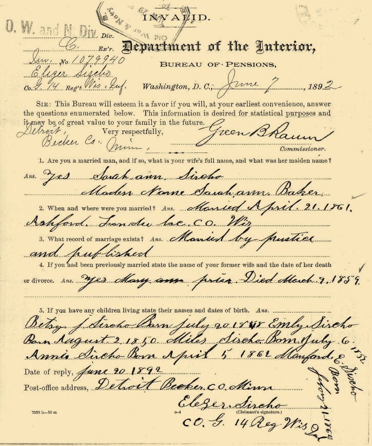 Minnesota and in 1892, Eleazer applied for a Civil War Pension