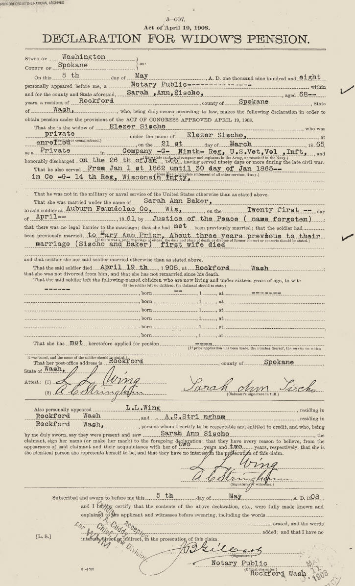 1908 May - Widow, Sarah Ann, applies for Civil War Pension - Washington
