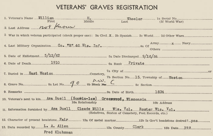 ***William H. Wheeler is also featured in the book, "Civil War Soldiers in the heart of Clark Co., Wisconsin."