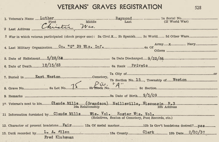 Luther married Julia Ann 5 Nov 1833. She was born 22 Oct 1817 in NY, the daughter of Philander and Betsey (Tichnor) Loomis. The children of Luther and Julia were: Eben Deloss (b. 19 Jul 1834), Charlotte Ann (b. 1 Jul 1840), and Floretta (b. 1847). They first located in Erie Co., NY and remained there until about 1843. The Raymonds then brought their family from New York to settle in the territory of Wisconsin in what is today Waukesha Co. Consequently, they were some of the first residents of Wisconsin when it became the 30th state, May 29, 1848. A year later, Luther was granted an 80 acre homestead claim of wild land, 1 Aug 1849 at the Land Office in Greenbay, WI, for Sec. 12 of Township 14-N, Range 18-E, Fond du Lac, Co. This property was developed into a productive farm. Unfortunately, Julia passed away 20 May 1863 in Campbellsport, WI, and was buried in the Union Cemetery. Not long afterward, Luther enlisted with the Union Army. He served with Co G, 39th Wis. Inf. after enlisting 28 May 1864 from Sheboygan, WI. He was mustered out 22 Sep 1864. In 1870, he moved with his family to a tract of wild land in Weston Township. When they first arrived, there was only a foot path to their home, and the Indians were numerous in the vicinity. It was a full 2 yrs. before their family even had a cow. By 1873, Luther was both farming and doing road work services including "chopping" along with Charles Kayhart, Jacob Demouth and Loren Gates. After being a widower for over 20 yrs., Luther died, 15 Dec 1883, and was buried in the East Weston Cemetery (now Chapel Hill).