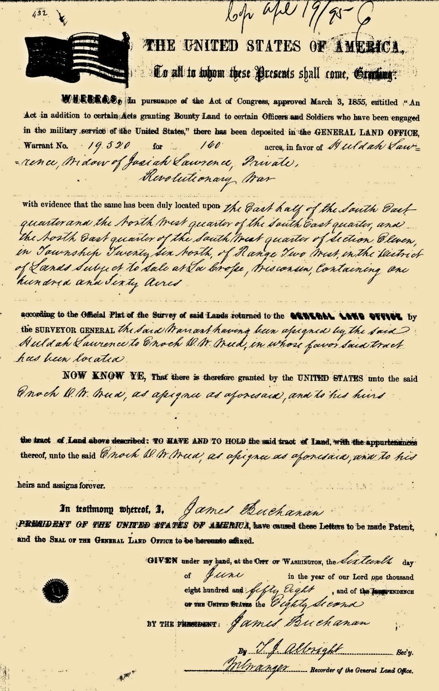 George Atkinson (Possibly 1st Reg., Wis. H. A. or the 7th Reg., Wis. Inf.) owned property in section 12, Eaton Twp., Clark Co., WI and it is noted on the 1880 Plat Map. Another 1880 Map indicates S. Stoneburg and P. Simmons were living on that land and they are also the owners listed on the 1893 Map. Apparently George sold the property to them sometime in 1880. The original Patentees of the tract were Enoch Day Woodbridge Weed & Huldah (Smith) Lawrence and the Warrantee was Josiah Lawrence. This 160 acres was granted at the La Crosse Land Office to Huldah Lawrence, 16 Jun 1858, who was the widow of Josiah Lawrence, a Pvt. in the Revolutionary War. [Grant Record]