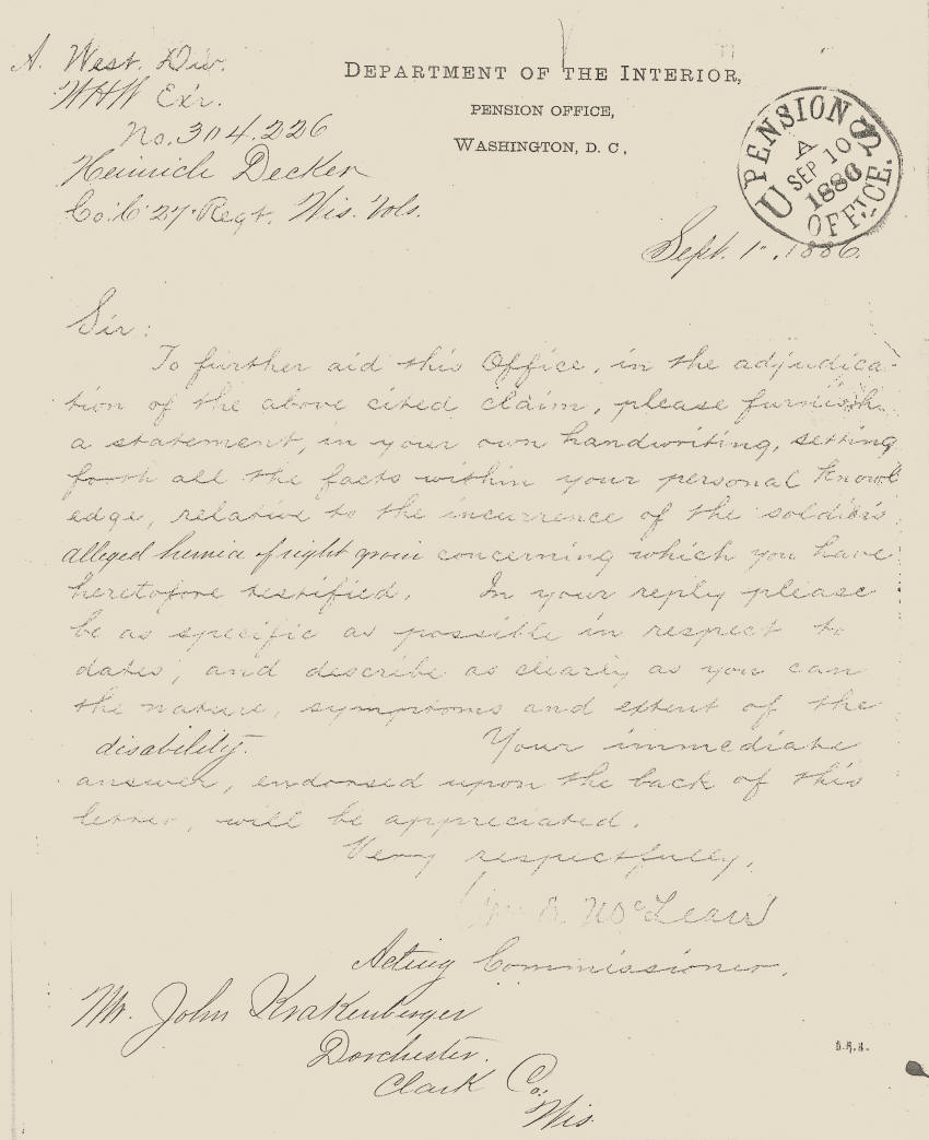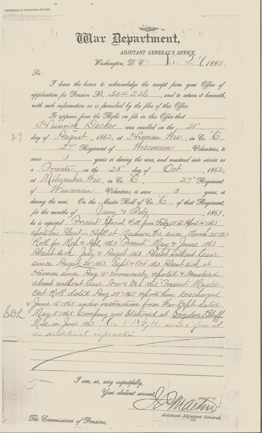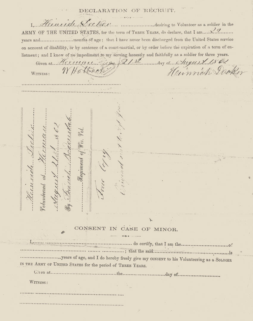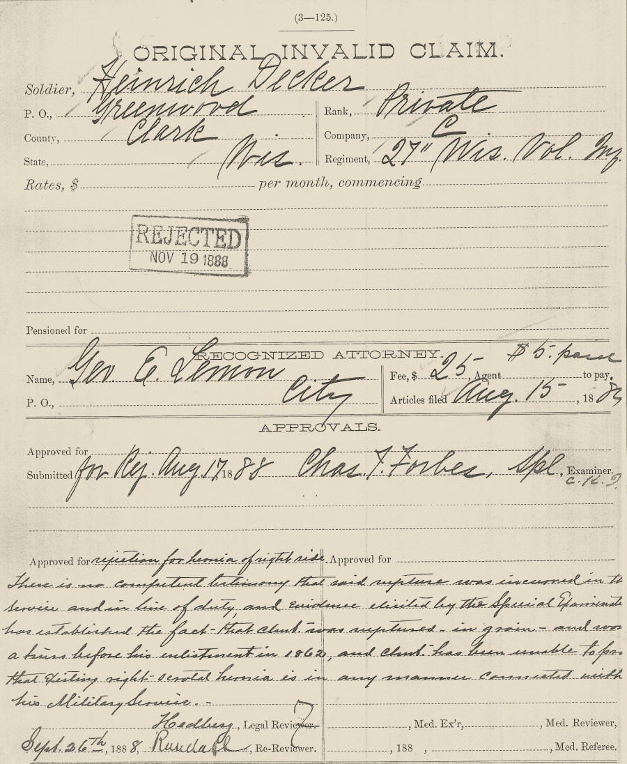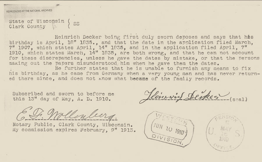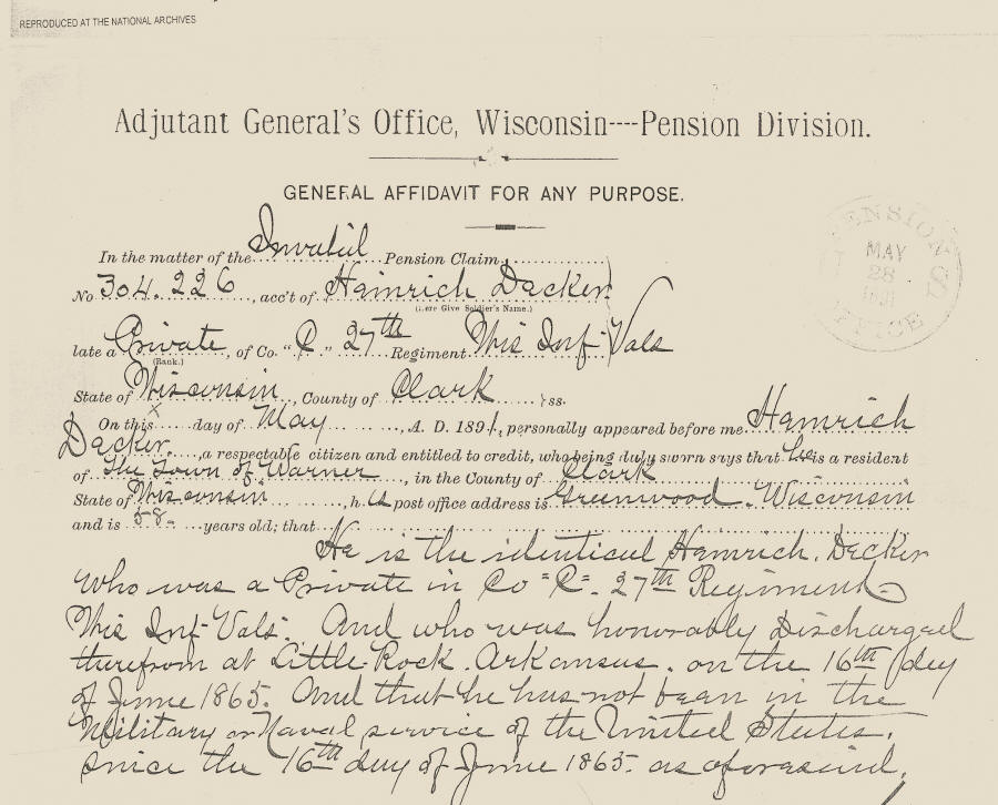 Heinrich Decker Military Record--Civil War Veteran of Clark county, WI