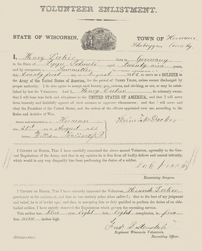 Enlisted August 21st, 1862, Herman Township, Sheboygan Co., WI