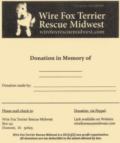 Enclosed is a "Donation in Memory of" form to Fox Terrier Rescue if you wish to use it. This is something Judy was very passionate about.